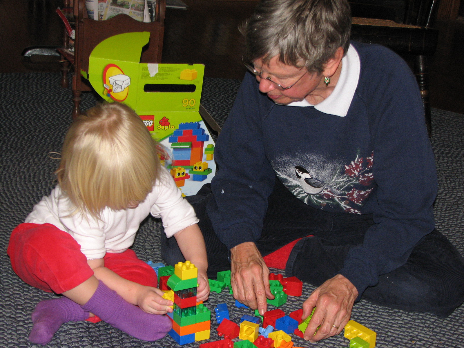 As you can see in some of the pics below, one of the biggest hits this Christmas was a set of Duplo lego blocks that Kev and I got for her. She made huge progress in the week we were with Pa and Eepa at working with these (though she started off pretty strong!) She built towers and robots and all sorts of great things... she also likes using red blocks to make "lub mcqueen" (that's how she says 'lightning mcqueen") and blue blocks to make "Sally" (Sally is lightning mcqueen's love interest in the movie Cars).